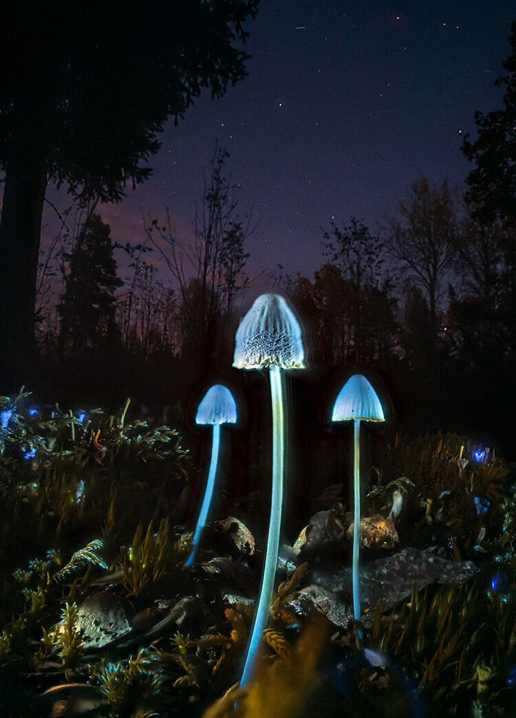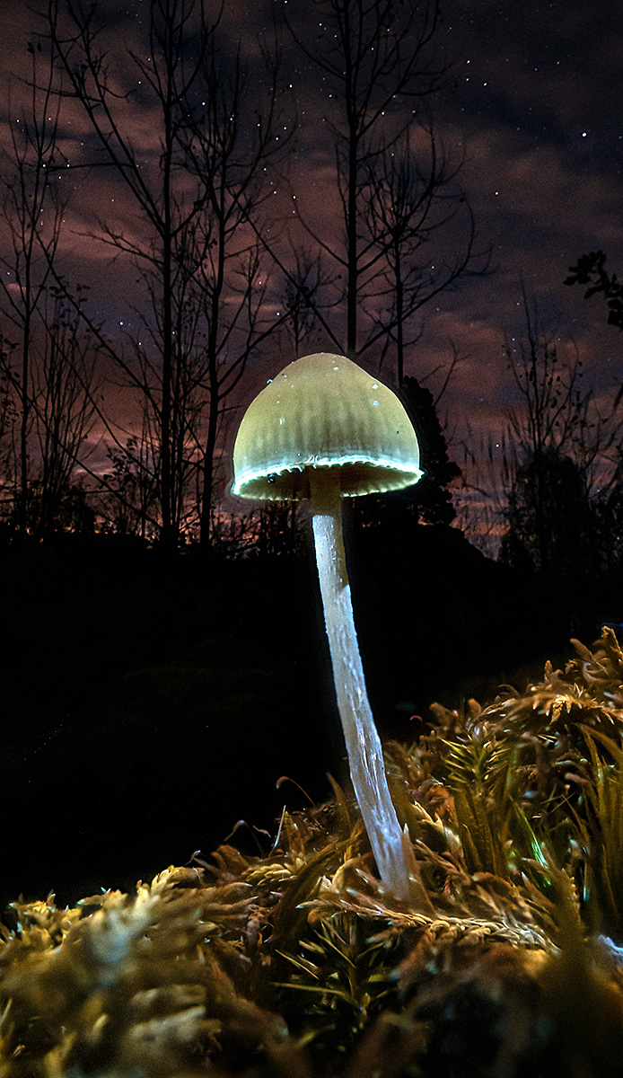 A view from planet Earth, low on the ground three small fungi almost seems like stargazing standing in moss and lichens, all things very important micro biology for our planet. Makes you wonder how other planets looks out there in the universe. The fungi, moss and lichens emits colors and light from chemical process using UV light, fluorescence. Above clear dark skies with the constellation Auriga rising.