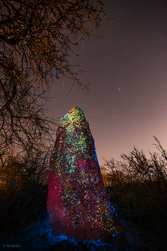 A UV light photo of a runic stone, so much lichens at the stone so during UV the texture totally disappear. The stone, which is made of red granite, is 275 cm high, 100 cm wide and 40 cm thick and has a rune height of eight centimeters. The rune stone stands in open pasture land near the Risbyle croft and between its partner stone U 161 and the road. Both Risbyle stones are dedicated to the great farmer Ulv in Skålhamra, a farm that in the Viking Age was located just southeast of Risbyle. The stone’s ornamentation consists of two winding rune snakes, which in the upper part of the motif are locked with an Irish leash and crowned with a large, Christian cross. The carving is extremely carefully carved and well preserved, the carving says: