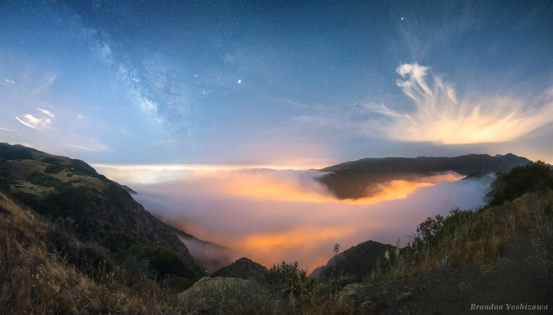 From the photographer: “This was shot on a ridge overlooking the Santa Monica Mountains and the Pacific Ocean. The fog was coming in from the coast and it was thin enough to let some of the light pollution shine through from below. The bright orange lights are road lights, and the white light near the horizon is a well known highway named Pacific Coast Highway. The fog acted as a barrier allowing the Milky Way to shine above. While not as bright as some darker areas, this is part of Los Angeles County with downtown Los Angeles only 25 miles away. While this shows a beautiful take on light pollution, it also shows the beauty of the night sky when conditions are ideal.
