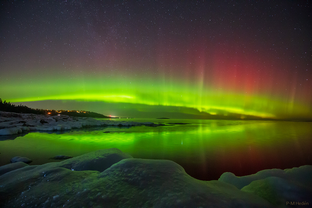 A clear cold night on the east coast standing in an icy landscape with a beautiful northern lights playing in different colors.