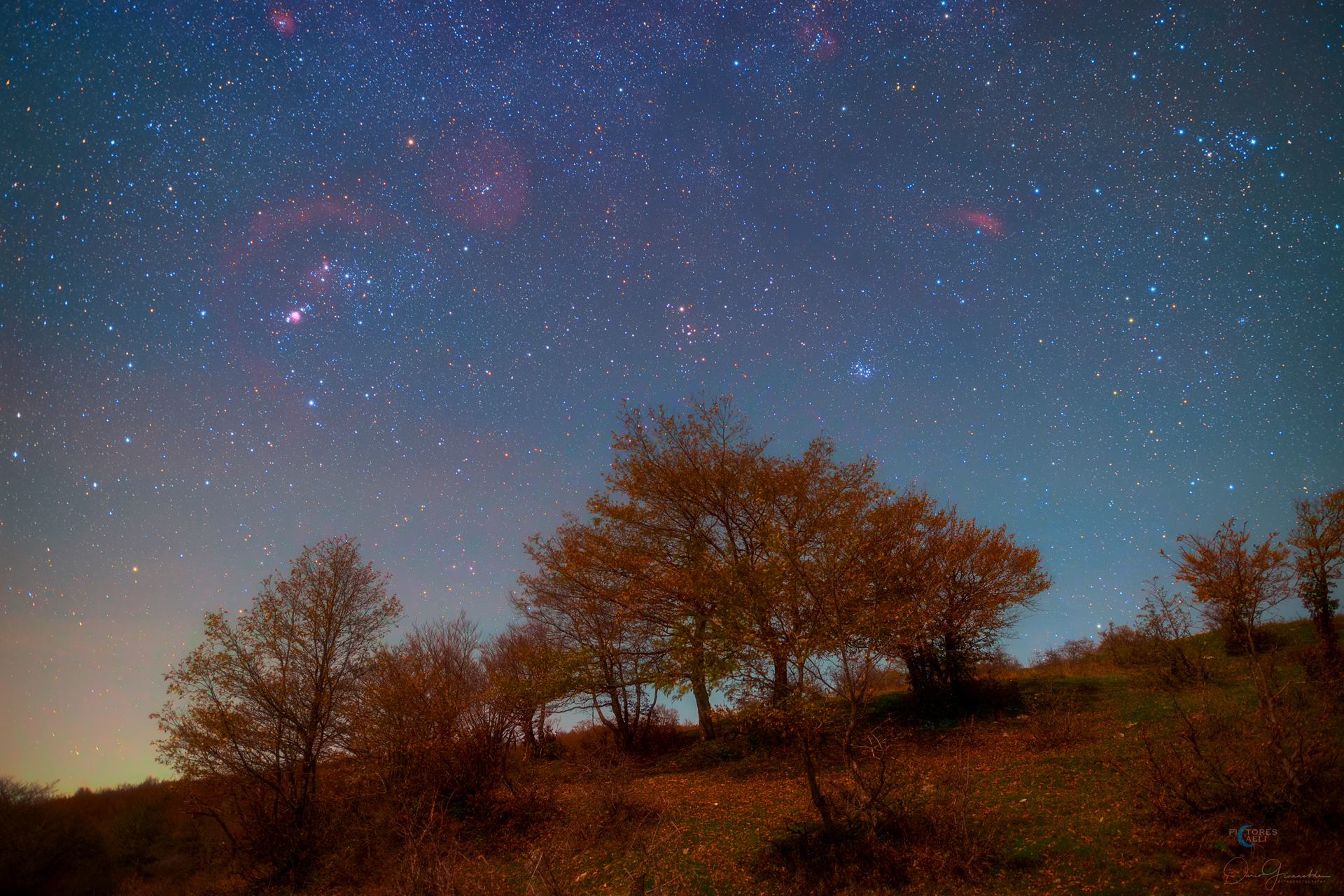 From the photographer: “As if in an autumn dream, I walk along the paths of the Nebrodi Mountains! The moon is high in the sky, illuminating the sky with a soft blue hue. In front of me, triangular-shaped trees stand out against the horizon, red with leaves still hanging from their slender branches. Above them, the stars of the constellations Orion and Taurus shine with a particularly intense glow thanks to the cool, clear atmosphere, imbued with the scent of the forest. The light in the sky is so beautiful and transparent that even the nebulae reveal their soft magenta glow. Everything stands still on this night that envelops us as if in a dream world.