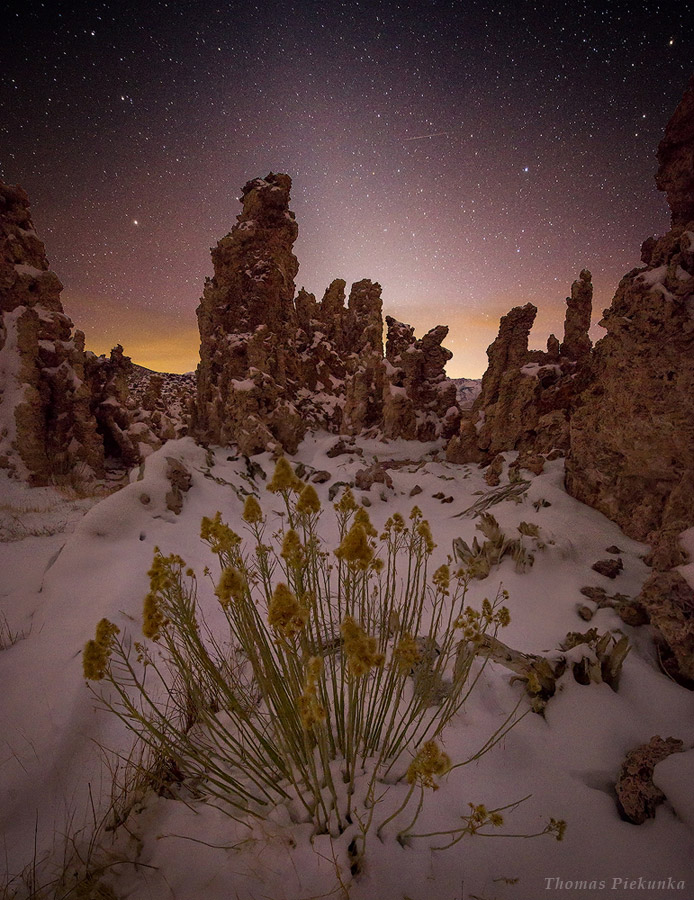 From the photographer: “There was heavy snow and cold conditions at Mono Lake, so I headed up and went to the West end of the South Tufa area and found this beautiful rabbit bush with a nice tufa formation behind it and the glowing Zodiacal Light behind it. A fortuitous alignment.”