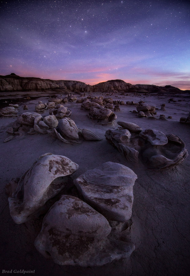From the photographer: “Alien Eggs found in the Bisti/De-Na-Zin Wilderness in New Mexico are captured at twilight as the stars begin to appear.”