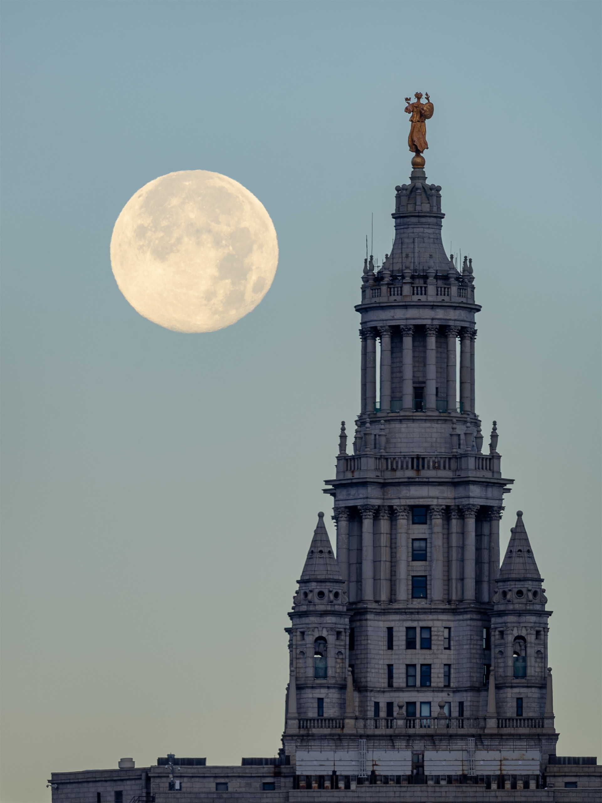 Secondary image: Single exposure of Civic Fame, who sits on top of the David Dinkins Municipal Building in New York City, observing the cold moon setting on December 5th.”