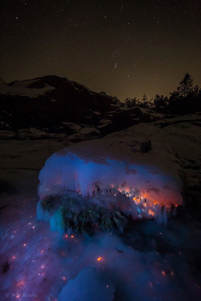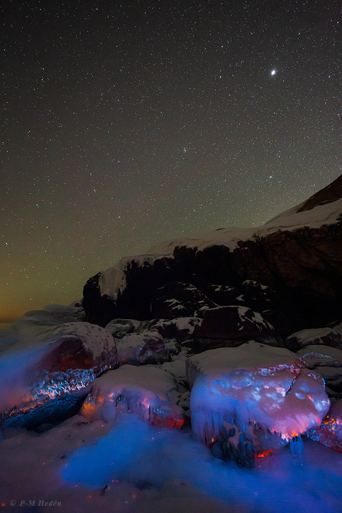 So why not head out to the east coast on a starry night! And indeed, the water level was very low. I could see barnacles on the rocks where the water’s edge used to be. Amazing ice formations everywhere and when I shone UV light many interesting things under the ice fluoresced in different colors. I have no idea what it was, but probably algae, seaweed and minerals.