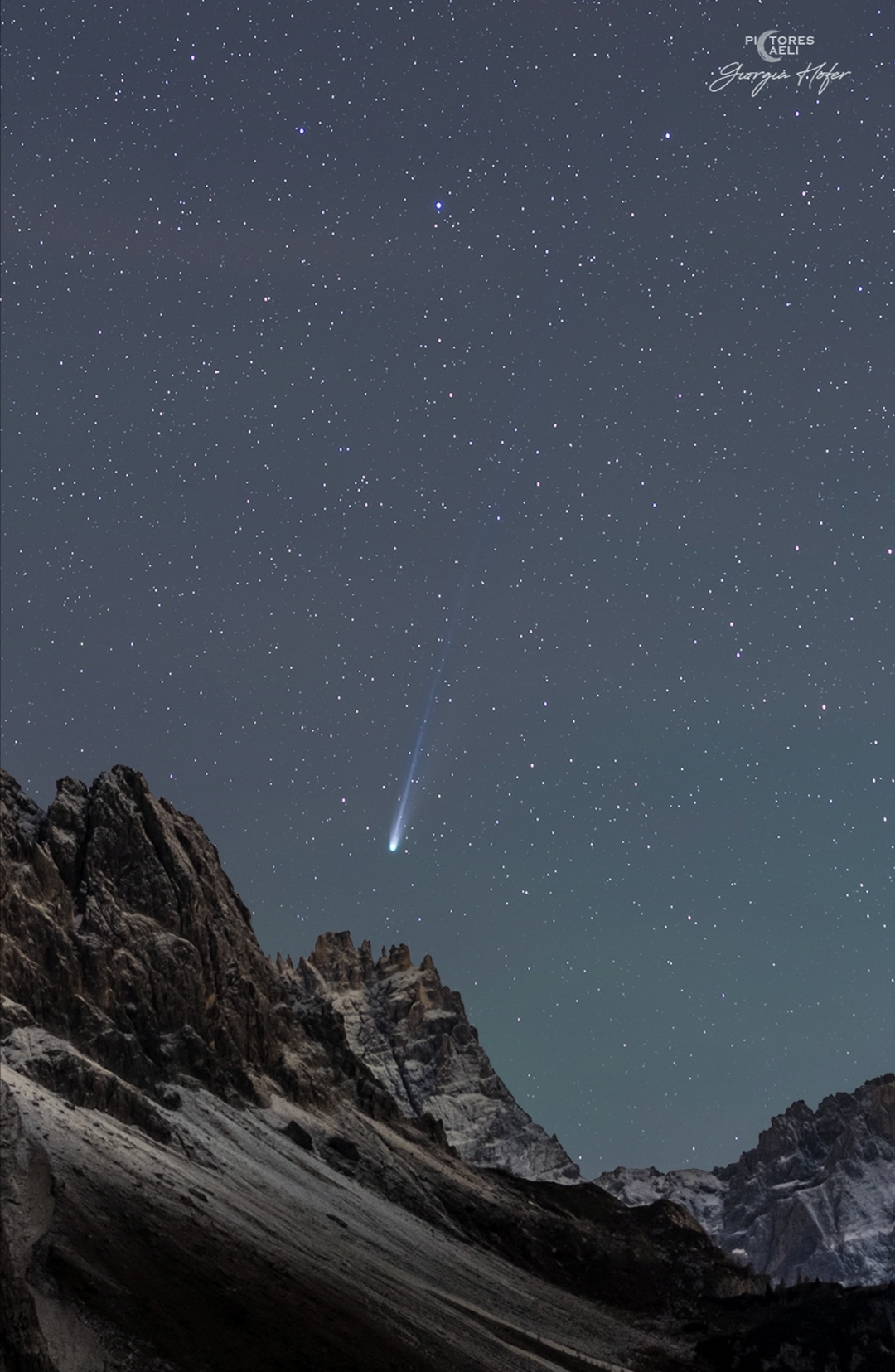 From the photographer: “Finally the bad weather gave some respite and I was able to capture the comet in all its glory near the peaks called Punta dei Tre Scarperi. The tail of the comet in the last few days has become very interesting, and from my shots the dust tail is selling very well. The comet was perceptible to the naked eye, beautiful.”