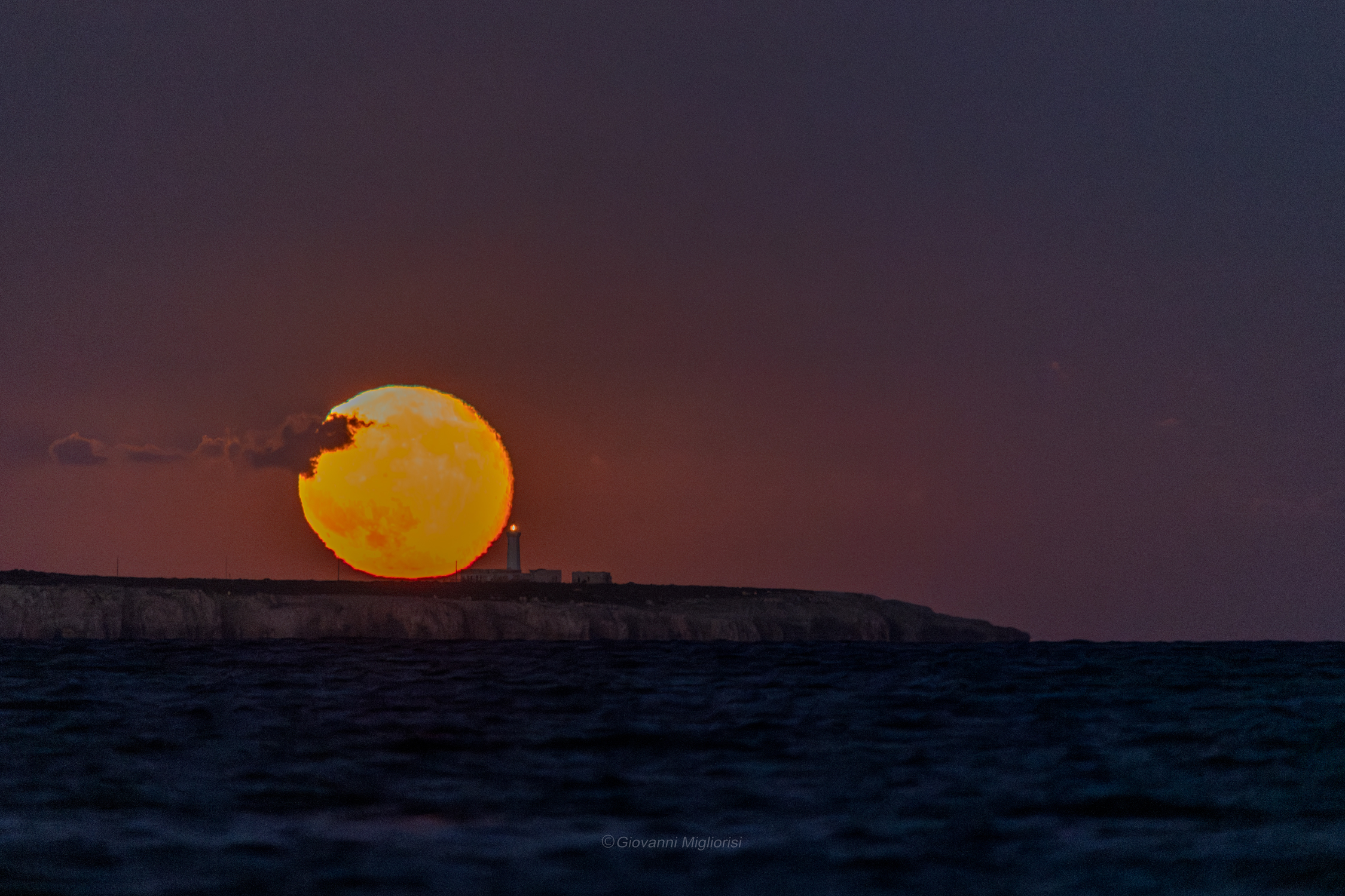 Secondary image: The Moon rise close the lighthouse Murro di Porco  above the Plemmirio natural reserve, in Syracuse Sicily. photographic shooting distance of more than 7,1 kilometer. apparent size of the moon equal to 70 meters.”
