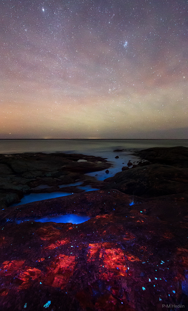After a couple of hours of driving, I arrived at the port that was supposed to be near the place with the crystals. Then how to find them was another question. But I had looked at Google Maps and saw a trail that I could take and then turn off towards the coast. After a rather sweaty walk with heavy equipment, I was able to locate the outcrops where the crystals would be. a beautiful place with the sea right on the horizon. When darkness fell, I could see a nice starry sky with noticeable airglow, faint northern lights in the north and the Milky Way. After searching for the crystals with a headlamp in the dark for a couple of hours I finally found them and solved them with the UV lamp and the crystals fluorescent red in the dark – beautiful!!”