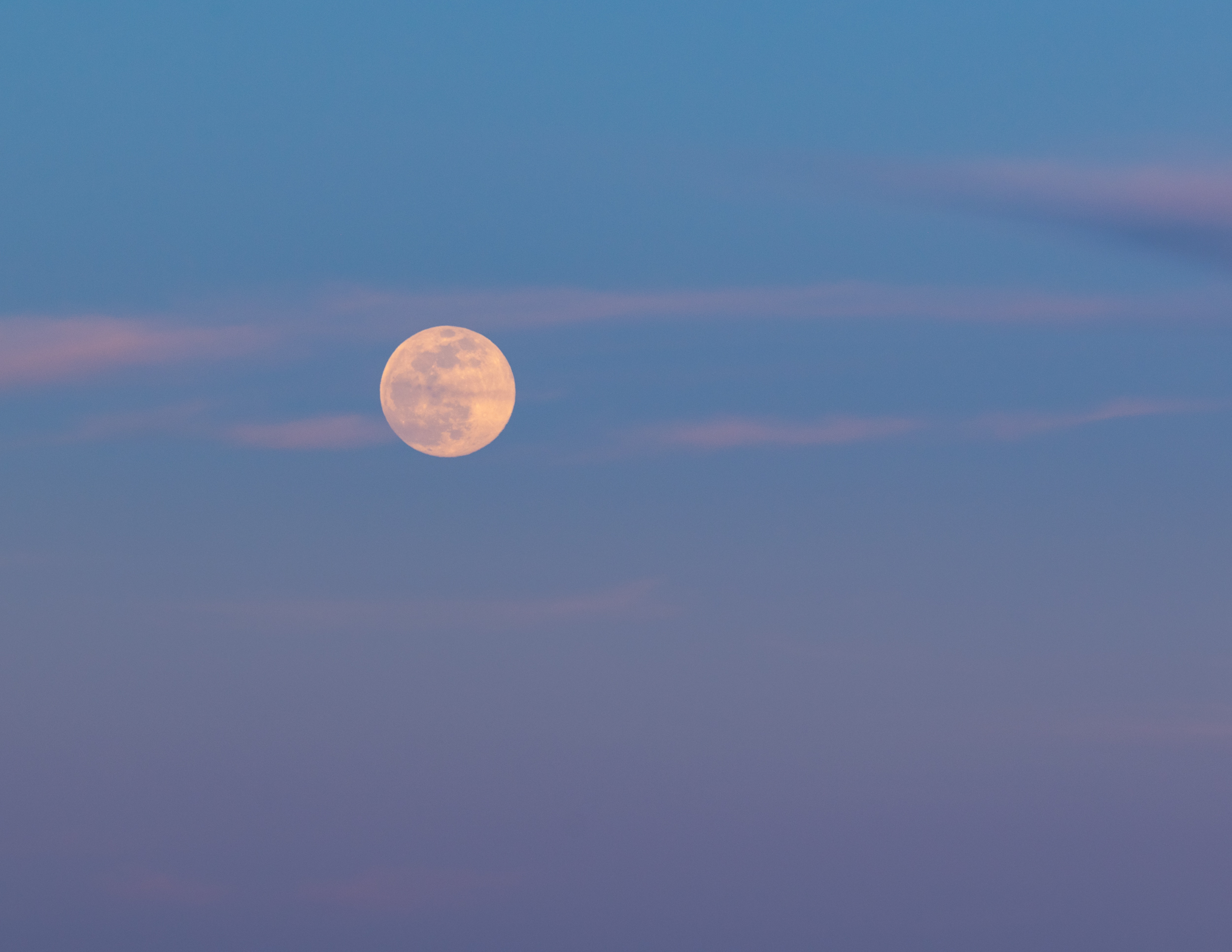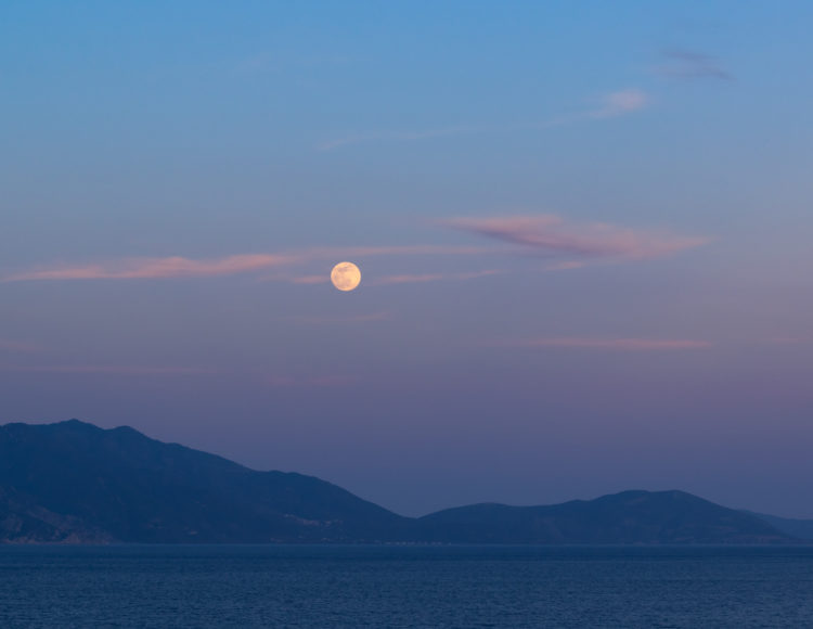 The Waxing Gibbous Moon (almost full at ~99% Illuminated) appears just after sunset, rising above the peninsula of Methana, captured with the Earth shadow with some thin clouds around it, creating an atmospheric scenery.