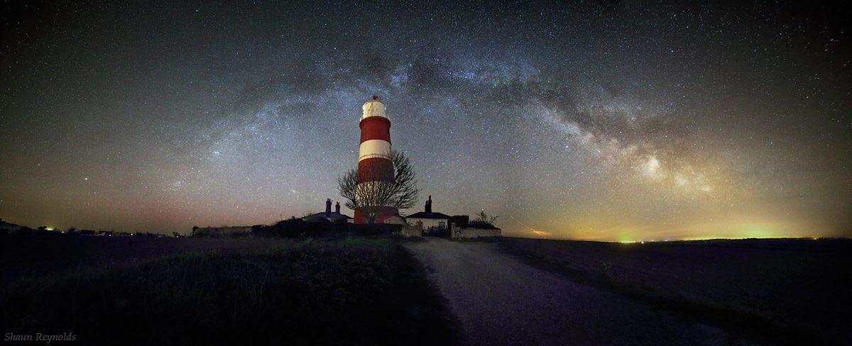 From the photographer: “A panoramic view of Hapisburgh lighthouse with the rising milky way taken just before astronomical darkness ended, with faint aurora activity to the north.”