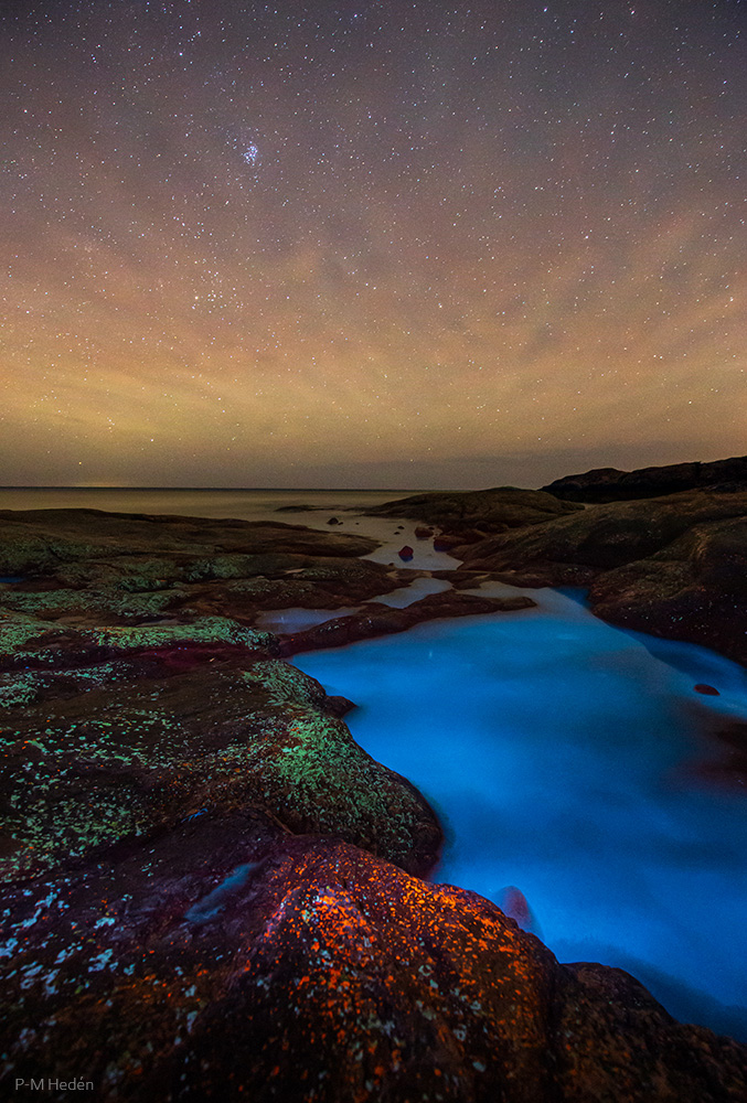 On the ground fluorescence lichens and water using UV light. Lichens glow under UV light because they contain natural fluorescent compounds, called secondary metabolites (like xanthones and acids), that absorb invisible ultraviolet radiation and re-emit it as visible light.