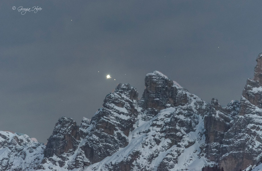 From the photographer: “It is the morning of February 4th, 2015, and Jupiter is about to set behind the Marmarole, Western Alps. With him are his four major satellites, in order from left: Callisto, Io, Europa and Ganymede.”