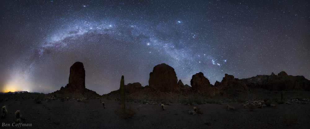 From the photographer: “A multi-row panorama showing the winter skies over Arizona’s Kofa Mountains. In the foreground you can see saguaro cacti, ocotillos, and a garden of cholla cacti. Signal Peak (far right side), the highest point in the Kofa Mountains, has a rare sprinkling of snow. The photo’s title comes from the word Kofa, which is an acronym for Kings of Arizona, a mine located in the mountains.”