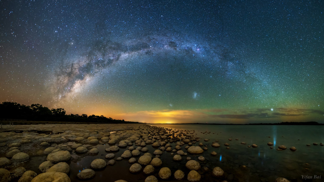 From the photographer: “The beautiful Milky Way across the sky. Standing under it looks like she is trying to light up the whole sky. On the ground is a special structure formed in shallow water called thrombolite.”