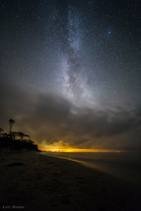 From the photographer: “This photo was taken at the West Beach of Peninsula Darß (Baltic Sea). The trees in the middleground belongs to a large coast forest, (Darßwald). They are called Windflüchter, because they must adapt as it grows to the strong wind from west. In the background you can see the light pollution from the city Rostock, south from Darß.”