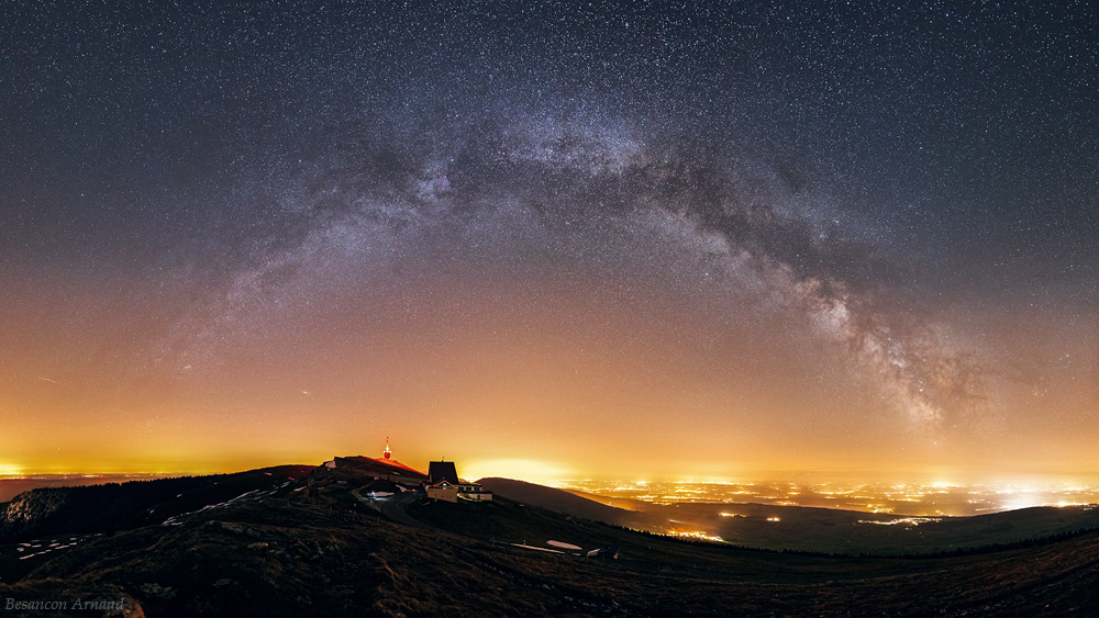 From the photographer: “Panoramic view composed from 60 images with the milky way over Swiss (Switzerland), from 1600m height. There are a lot of light pollution visible from Neuchatel and many other small cities. We can see Andromeda galaxy too, on the left side and the Swisscom antenna in the middle.”
