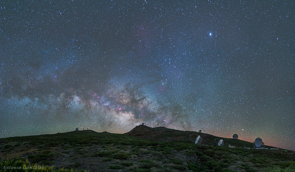 From the photographer: “Some of the large telescopes in the Roque de Los Muchachos Observatory. We can see the largest telescope of the world (in visual and near infrared), Gran Telescopio Canarias – GTC, with 10,4 m. of diameter. It is the first dome, over the mount border, on our right. And close the gamma ray detectors (Magic I and Magic II), and the next (now in construction) the LST, with 22 m. of diameter.”