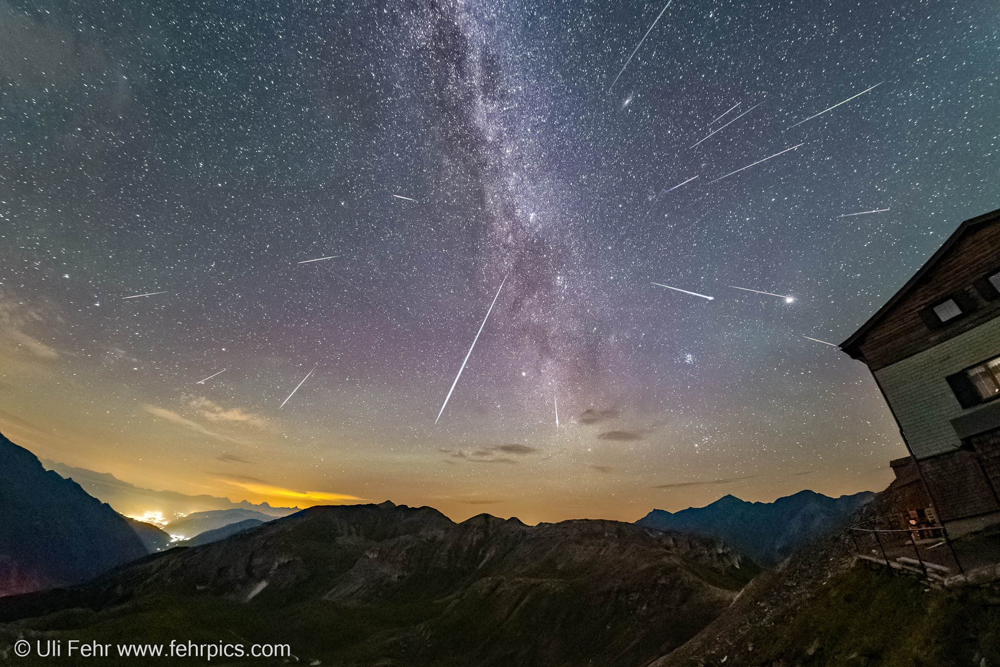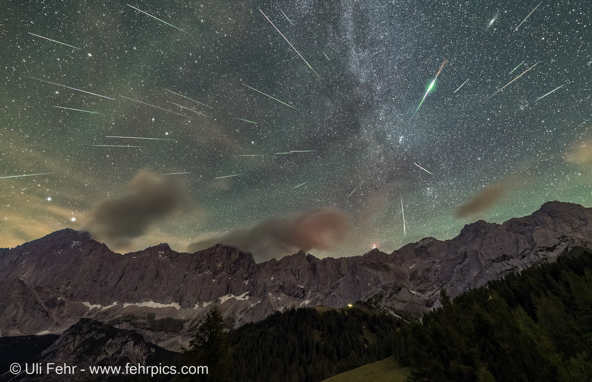 A photo composite of multiple exposures. From the photographer: “The 2023 Perseid meteor shower as seen above famous Dachstein Mountains and – one day after the peak – from “Edelweißspitze” at 2572 m altitude at the Grossglockner High Alpine Road in Austria.