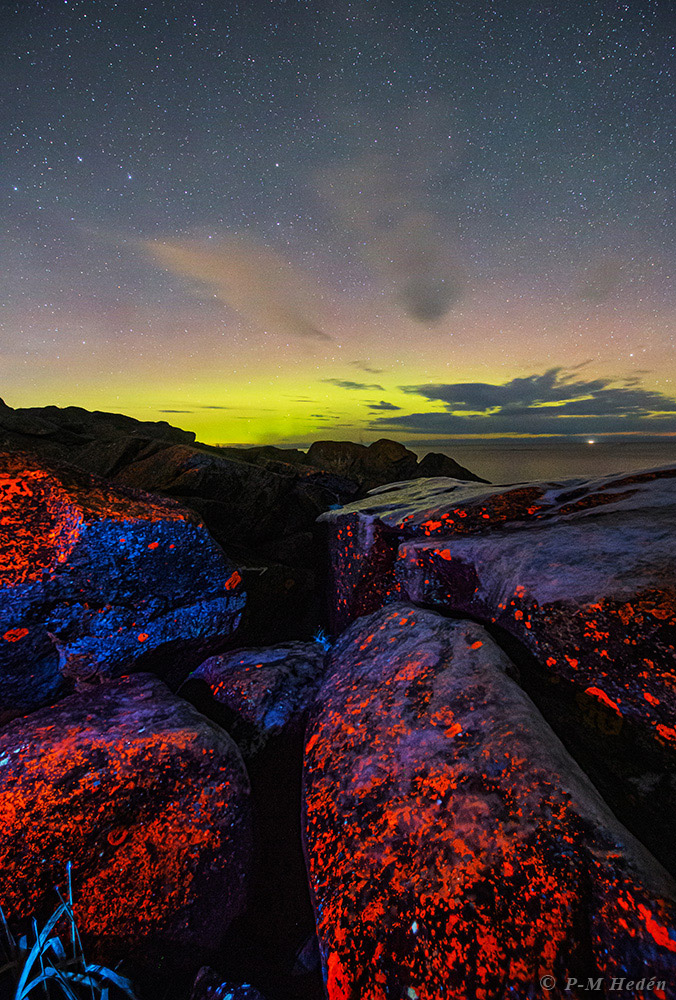 Starry sky over the Baltic Sea with faint Aurora Borealis and the Big Dipper visible. The red rocks fluorescence by UV light, it is the lichens who get such lovely color when exposed to ultraviolet radiation, many substances will glow (fluoresce) with colored visible light. The color of the light emitted depends on the chemical composition of the substance.