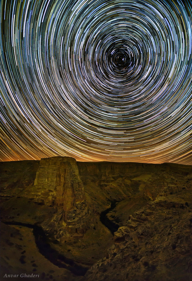 A photo composite of multiple exposures. From the photographer: “Rotation of stars at the top of the historical castle of Qamchqai in Bijar city, Kurdistan, Iran.”