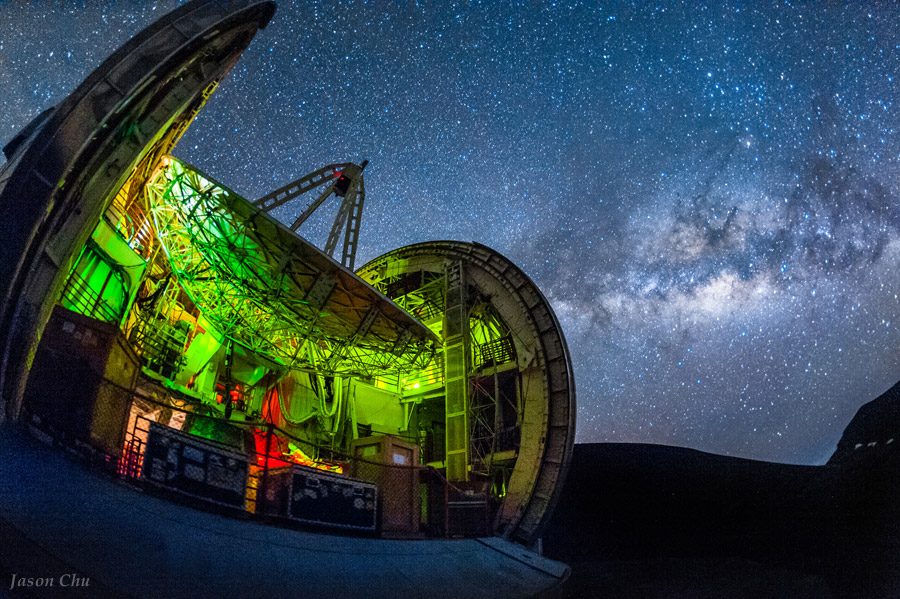 From the photographer: “The Caltech Submillimeter Observatory under the arch of the Milky Way. This is probably one of the last photos of CSO in use, before operations ceased in Sept. 2015. The telescope is lit by dim red and green LED lights. This photos hows the connection between our desire to explore the universe, and the cosmos itself.