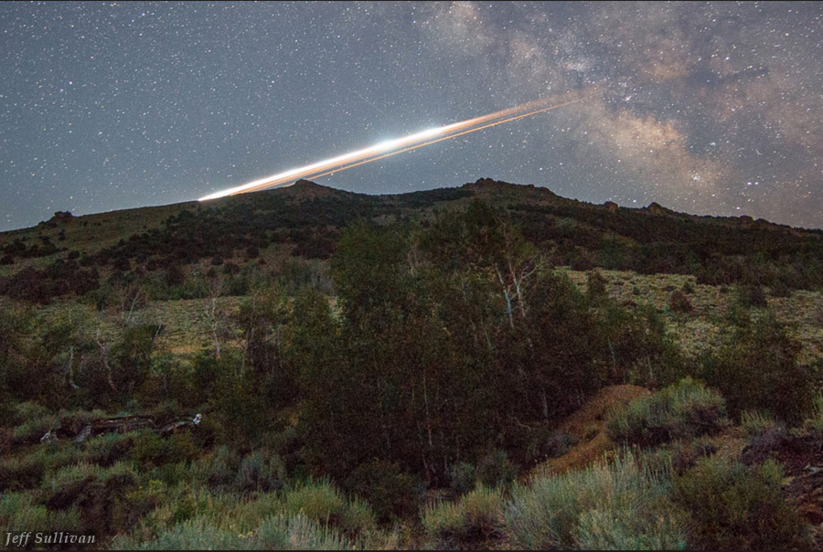 From the photographer: “Space debris enters the atmosphere near Mammoth Lakes, California at 9:37 pm July 27, identified as the second stage from the first Chang Zheng 7 rocket, launched Jun 25, reentered at 0440 UTC. A sonic boom (or sound from an explosion) arrived 8 minutes later at 9:45 pm. The image is a single 30-second exposure captured on a Canon EOS 6D camera and Canon 14mm f/2.8 lens. I was all set up facing north, just about to start a star trails shot, when I saw a light behind me. I quickly swiveled the camera on the tripod and hit the shutter release. The photo was captured 21 minutes befroe the end of astronomical twilight, so the Milky Way is just starting to appear, and the sky still has some “blue hour” color remaining.”