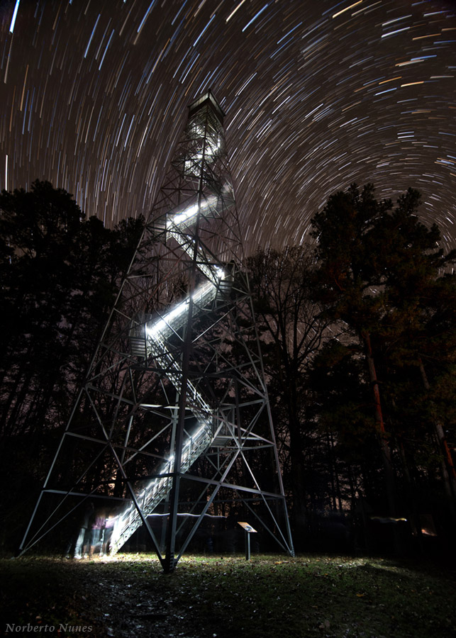 Technical details: This is a composite, the star trails being multiple shots, then there were multiple shots that it took for people to climb the tower.”