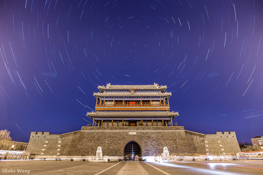 From the photographer: “YongDing Gate is an ancient monument located in the south of old Beijing city. It was built in 1553 B.C. One of the characteristics of ancient Chinese architecture is the building facing south with the back to the north. So Polaris is right above the gate.
