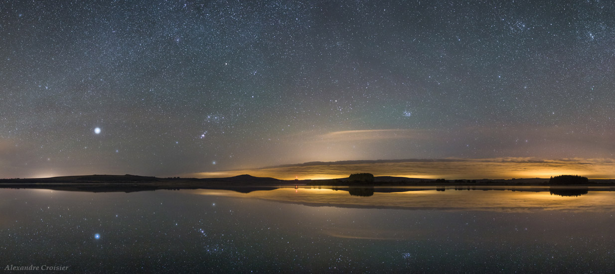From the photographer: “Reflection over Brennilis’s lake. Orion, Sirius, the Pleiades, are perfectly reflecting on the lake (no wind presence). A few minutes before I take this picture, clouds were present. That’s why you can see at the horizon light pollution. This place is one of the darkest in Brittany, but when clouds are present, pollution is still present. It is a real danger.”