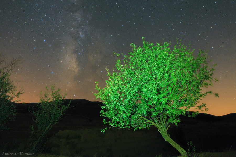 From the photographer: “Central part of the Milky Way in Sagittarius shines over a green tree in Alborz mountains, northern Iran. Light pollution of the nearby cities can be seen at the right side of the image.” © Amirreza Kamkar