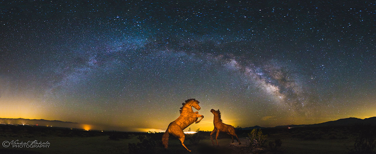 From the photographer: “This image is taken during my recent trip with other photographer friends in Anza Borrego Desert, Borrego Springs, California. It is a blend of 18 vertical shots to get 180 degree panorama and exposure blended with 1 shot for foreground on Two Horses sculptures by Ricardo Breceda. These images are taken in Borrego Springs Desert, California. The Dark horse in the Milky Way core (the central bulge) was very visible to naked eye in spite of strong light pollution from Mexico and other nearby towns.”