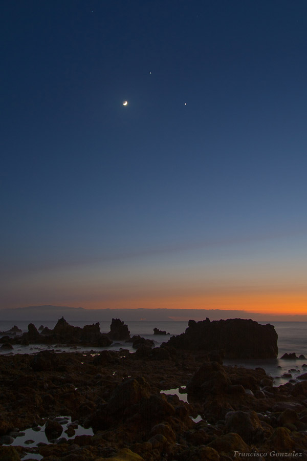 From the photographer: “I took this photo in Playa San Juan Tenerife, where you can clearly see the triangulation of the two planets and the moon at sunset.”