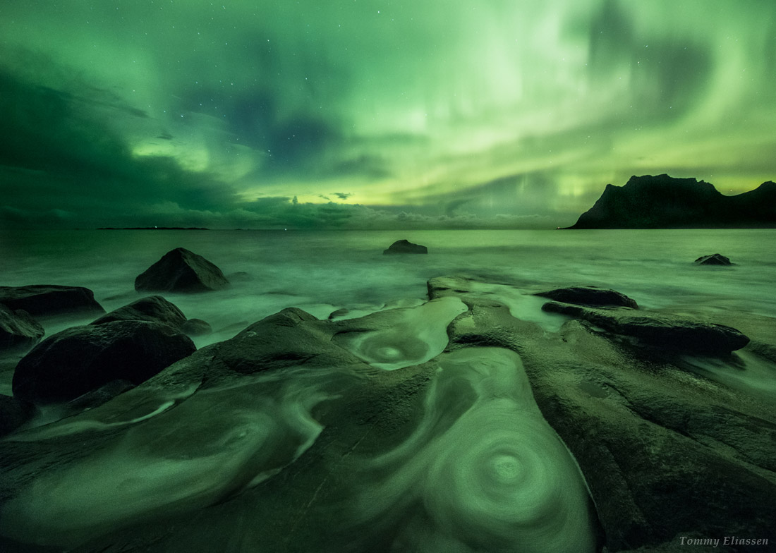 From the photographer: “Waves crashing in over the Uttakleiv shoreline on a stormy night in October. In between the clouds the aurora put on a magnificent show.