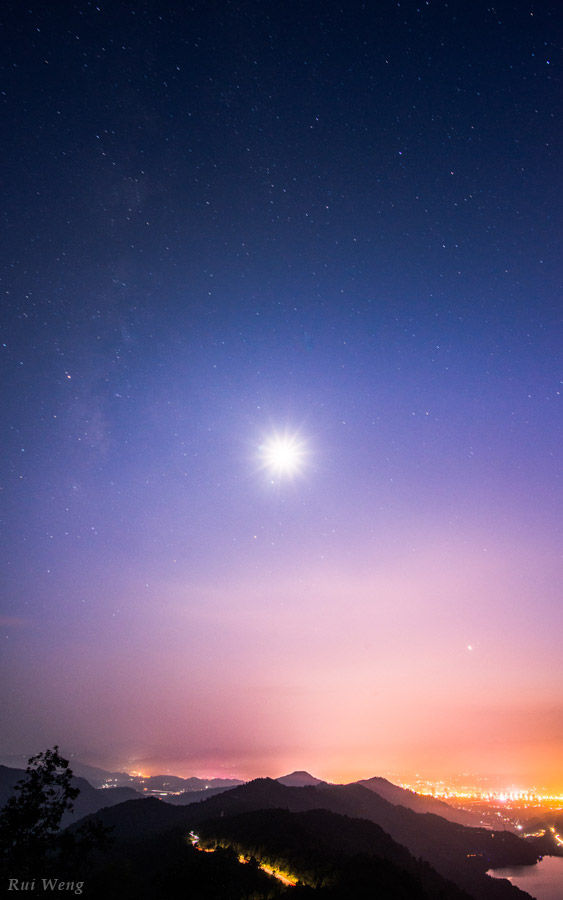 From the photographer: “Late autumn evening, surrounded by small town lights, moonlight, and the galaxy looming!